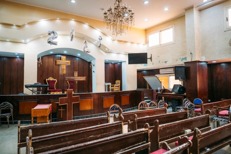 The local Church is barely noticable among a row of buildings, all in varying states of disrepair and surrounded by rubbish. With temperatures at the time being about 12°C, it was cold for the women in Upper Egypt who are used to summer heat reaching nearly 50°C. Inside the unheated church, they were bundled in warm wrappings.